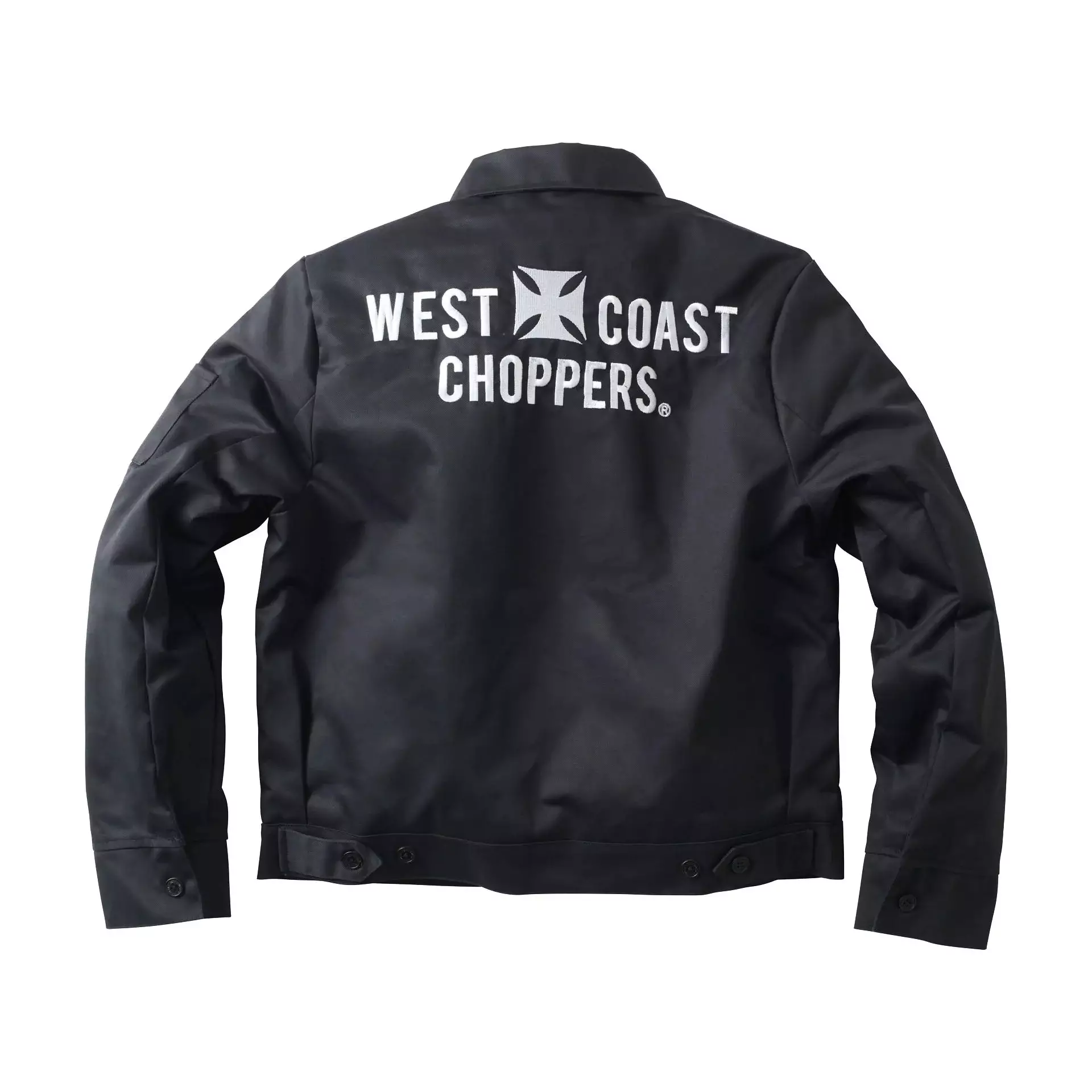 WCC Workertakki, musta. Workertakki, työtakki, jossa WCC:n logo on brodeerattuna valkoisella langalla vasempaan rintaan. Lisäksi vasemmassa etuhelmassa on ommeltuna pieni logomerkki. Selässä on iso brodeeraus, valkoisella langalla WCC:n logo. Edessä avonaiset listataskut, vasemmassa hihassa lisäksi pikkutasku. Helmassa on nappitampit, joiden avulla helman ympärysmittaa saa hiukan hienosäädettyä. Hihansuissa on myös napit. Vuori on kevyesti topattu ja ruututikattu, vasemmassa vuorin etukappaleessa on povitasku.