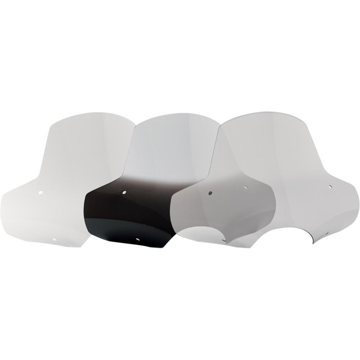 Great protection in a sleek, stylish package Solid, four-point mounting system Available in gradient black, clear and solar Measures approximately 68,5 cm W x 45,5 cm H (27" x 18") above headlight Fits most round headlights Made of Lucite® for excellent optics and durability Included four-point mounting hardware consists of polished billet aluminum handlebar clamps that fit 25,4 mm (1") and 22 mm (7/8") handlebars (with sizing bands), aluminum adjustable fork clamps that fit 35 mm to 41 mm forks and stainless steel support rods and socket-head screws NOTE: To remove, simply loosen four socket-head screws, leaving clamps on bars for perfect reattachment of shield.