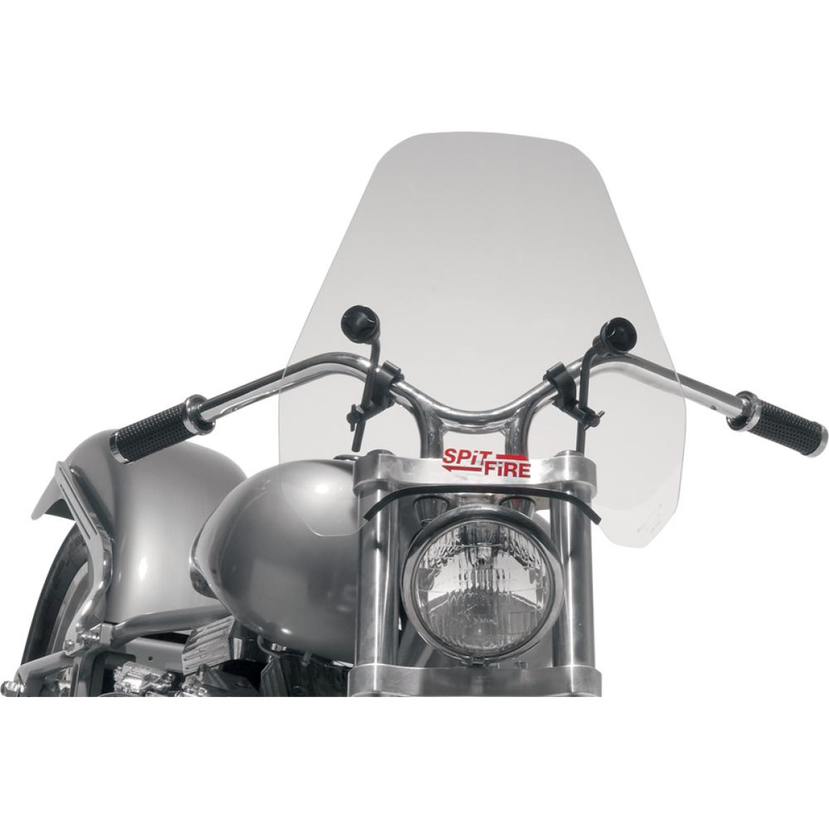 Great protection and devastating style come together in the Spitfire Sport Shield Constructed of 3 mm (1/8") acrylic with red graphics Fully adjustable; mounts/dismounts in seconds; fits both 22 mm (7/8") and 25,4 mm (1") handlebars For round or rectangular headlights Height: 38 cm (15") above headlight; width: 44,5 cm (171/2")