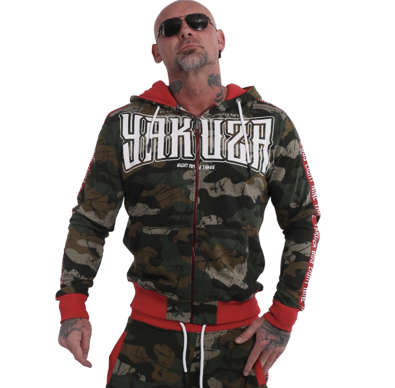 Yakuza huppari Casual Day. Vetoketjullinen, vihreä camo huppari, jossa iso, valkoinen Yakuza-painatus edessä. Hihoissa olalta hihansuihin ulottuvat punaiset tehostenauhat valkoisella tekstillä. Edessä taskut, helmassa ja hihansuissa punaiset resorit, hupussa nyöri. Materiaali 80 % puuvilla, 20 % polyesteri.