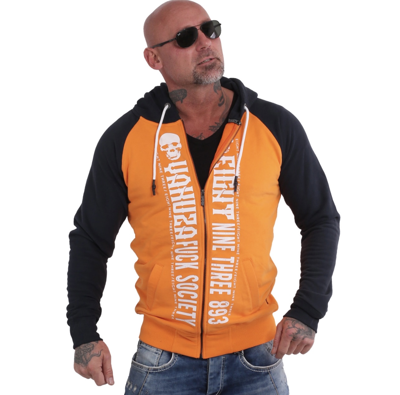 Yakuza huppari Fck Society, oranssi/tummansin. Vetoketjullinen, kaksivärinen huppari, jossa näyttävät painatukset etuketjun molemmin puolin, sekä selän yläosassa. Edessä taskut, helmassa ja hihansuissa resorit, hupussa nyöri. Materiaali 80 % puuvilla, 20 % polyesteri.