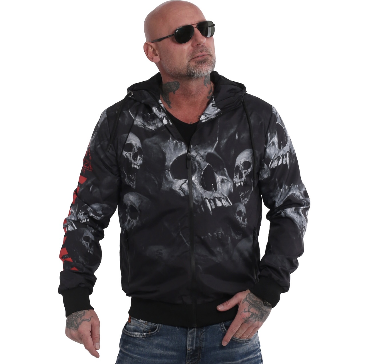 Yakuza Muerte Skull tuulitakki upealla punaisella hihaprintillä. Kevyt, vetoketjullinen takki, jossa edessä kaksi vetoketjullista taskua. Myös vuorissa on vetskallinen povari. Povarin vieressä pieni reikä ja joustava nauhasilmu mahdollista kuulokejohtoa varten. Materiaali 100 % polyesteri., hienopesu.