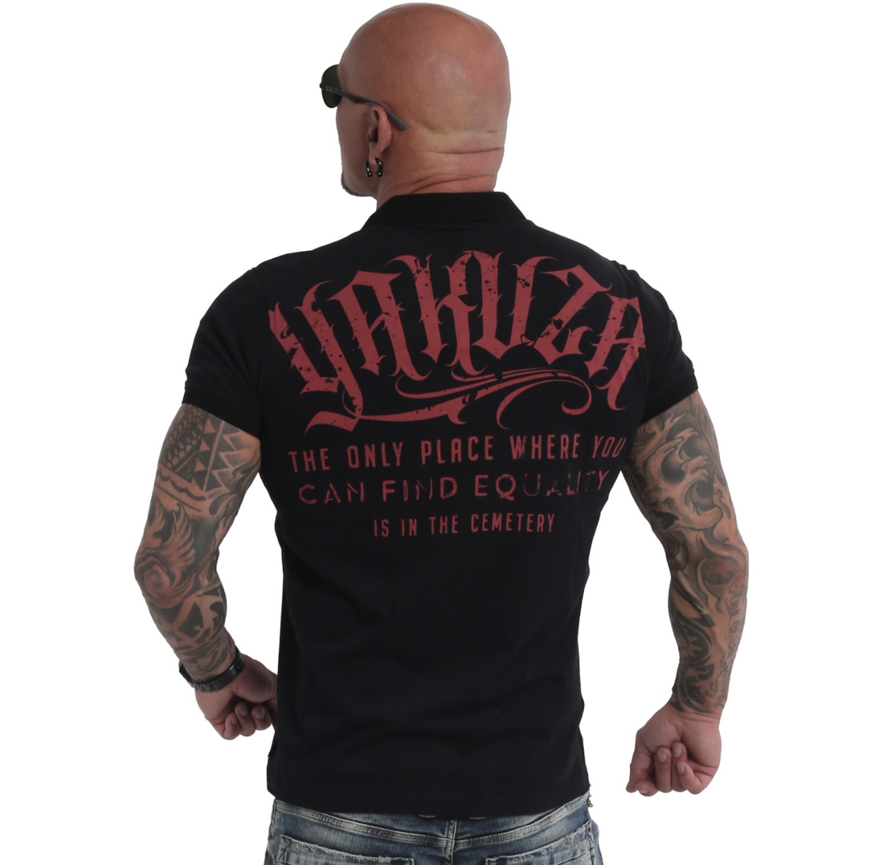 Yakuza pikeepaita Equality. Musta pikeepaita, jossa iso printti selässä ja pienempi vasemmassa rinnassa. Materiaali 100 % puuvilla. Kuvan malli on 182 cm pitkä ja käyttää kokoa XL.